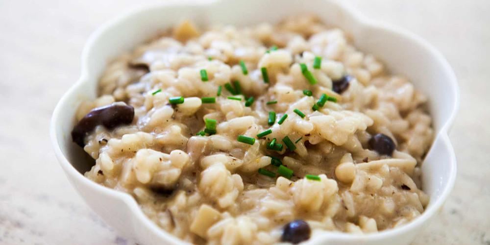 Σε ένα τηγάνι σοτάρετε με το ελαιόλαδο το κρεμμύδι, το σκόρδο, προσθέτετε το ρύζι και ανακατεύετε για ένα έως δύο λεπτά μέχρι να γυαλίσει. Ρίχνετε τα μανιτάρια, αφού πρώτα τα έχετε ψιλοκόψει, και σβήνετε με το κρασί.
