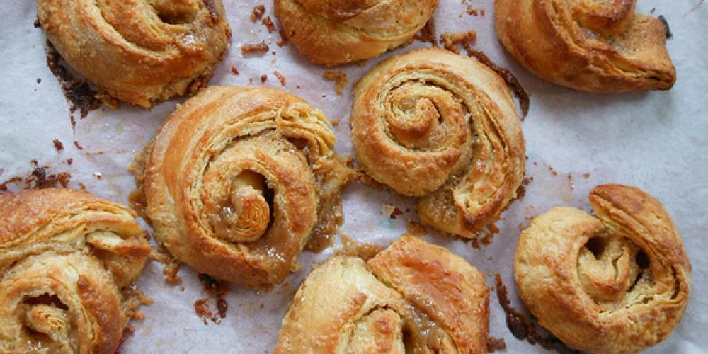 Προθερμαίνετε τον φούρνο στους 180. Δουλεύετε για λίγο τη ζύμη και τη μοιράζετε σε τέσσερις ίσες μπάλες ζύμης. Ανοίγετε ένα-ένα τα κομμάτια ζύμης σε λεπτό ορθογώνιο φύλλο με πλάτος 20 εκ. περίπου. Σε μπολ αναμειγνύετε τη ζάχαρη και την κανέλα. Κόβετε οριζόντιες λωρίδες με πλάτος 10 εκ. η κάθε μια, τις αλείφετε με το ταχίνι.