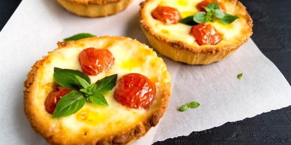 Ψήνετε για 15 λεπτά, μέχρι να λιώσουν τα τυριά. Βγάζετε τα ταρτάκια από το φούρνο, γαρνίρετε με φυλλαράκια βασιλικού και σερβίρετε.