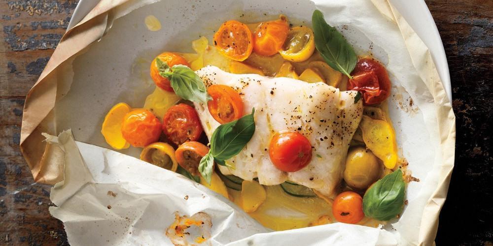 Κόβετε το λεμόνι σε λεπτές φέτες και τις πιπεριές και τις βάζετε πάνω στο ψάρι. Κλείνετε τη λαδόκολλα με σπάγκο και ψήνετε στους 180 βαθμούς για 30 λεπτά.