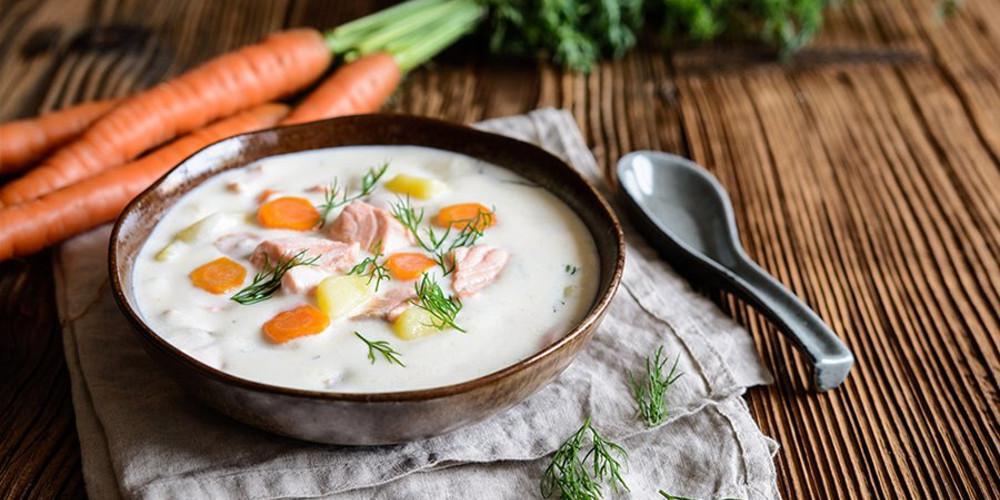 Ρίχνετε τις πατάτες, τα καρότα, το πράσο και το νερό, ανακατεύετε και αφήνετε τα λαχανικά να βράσουν. Προσθέτετε το σολομό, τον μισό άνηθο, την κρέμα γάλακτος, το μπαχάρι και όσο αλατοπίπερο επιθυμούμε.