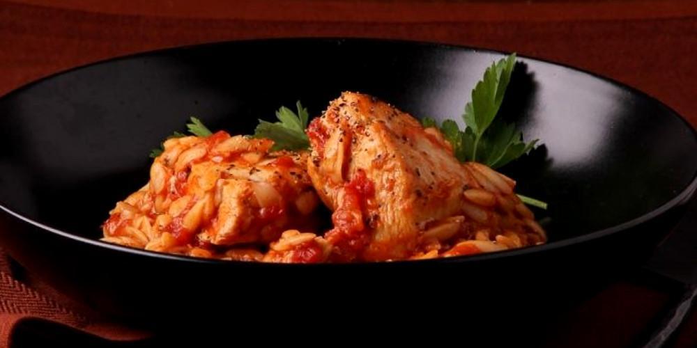Προσθέτετε τον πελτέ και ανακατεύετε. Προσθέτετε το κοτόπουλο και σβήνετε με κρασί. Προσθέτετε την ντομάτα και το νερό και αφήνετε να πάρει βράση. Μετά από λίγο, μεταφέρετε στη γάστρα με τα ντοματίνια και σκεπάζετε με καπάκι. Μαγειρεύετε στους 170 βαθμούς για 1 ½ ώρα.
