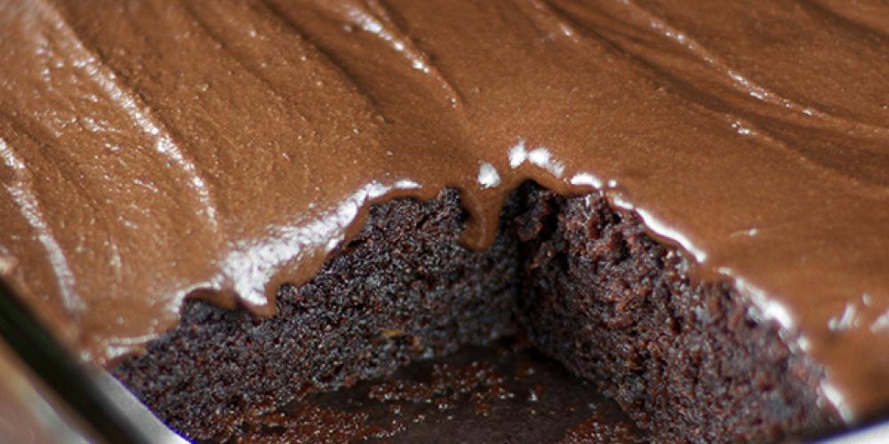 Προσθέτετε το νερό και ανακατεύετε. Τοποθετείτε κόσκινο στο μπολ και κοσκινίζετε το αλεύρι, το μπέικιν πάουντερ και το κακάο. Ανακατεύετε απαλά μέχρι να ενωθούν τα υλικά μεταξύ τους. Αδειάζετε το μείγμα σε λαδωμένη φόρμα για κέικ ή πυρέξ. Ψήνετε για 30 λεπτά στη μεσαία σχάρα, στον αέρα.