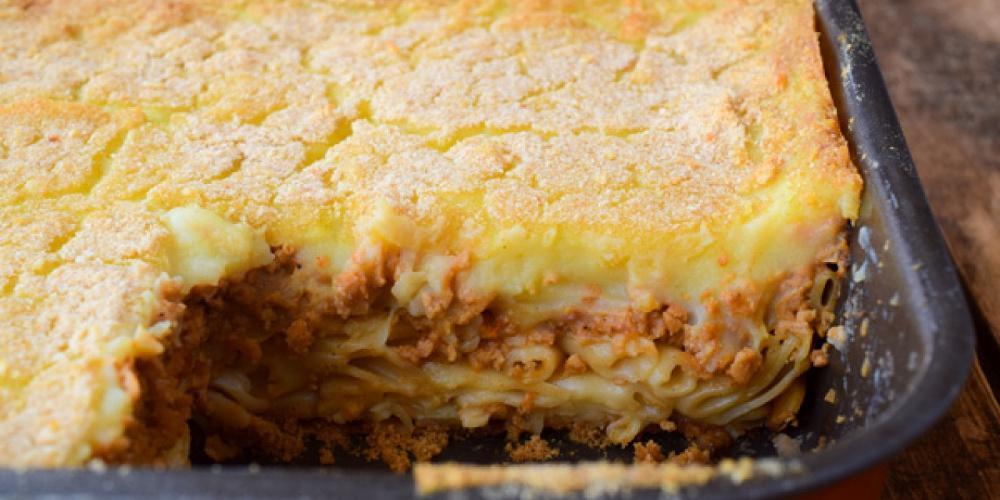 Προσθέτετε αμέσως τη μαργαρίνη και ανακατεύετε καλά. Όταν το μείγμα είναι έτοιμο, το αφήνετε στην άκρη να κρυώσει πολύ καλά. Αφού κρυώσει, απλώνετε τον πουρέ πάνω από τα μακαρόνια στο ταψί. Πασπαλίζετε την επιφάνεια του πουρέ με αρκετή τριμμένη φρυγανιά. Ψήνετε για περίπου 35-40 λεπτά, μέχρι να ροδίσει ο πουρές και να κάνει χρυσαφένια κρούστα.