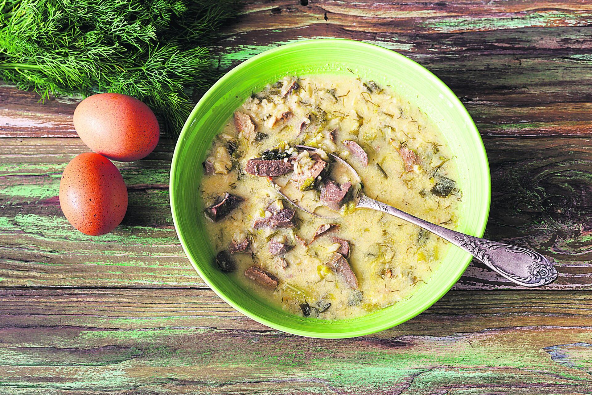Σε ένα μπολ χτυπάτε τα αβγά μέχρι να αφρίσουν, προσθέτετε, χωρίς να σταματήσετε το χτύπημα, σιγά σιγά τον χυμό λεμονιού και λίγο από το ζουμί της σούπας. Περιχύνετε τη μαγειρίτσα με το αβγολέμονο, ανακινείτε λίγο την κατσαρόλα και σερβίρετε.