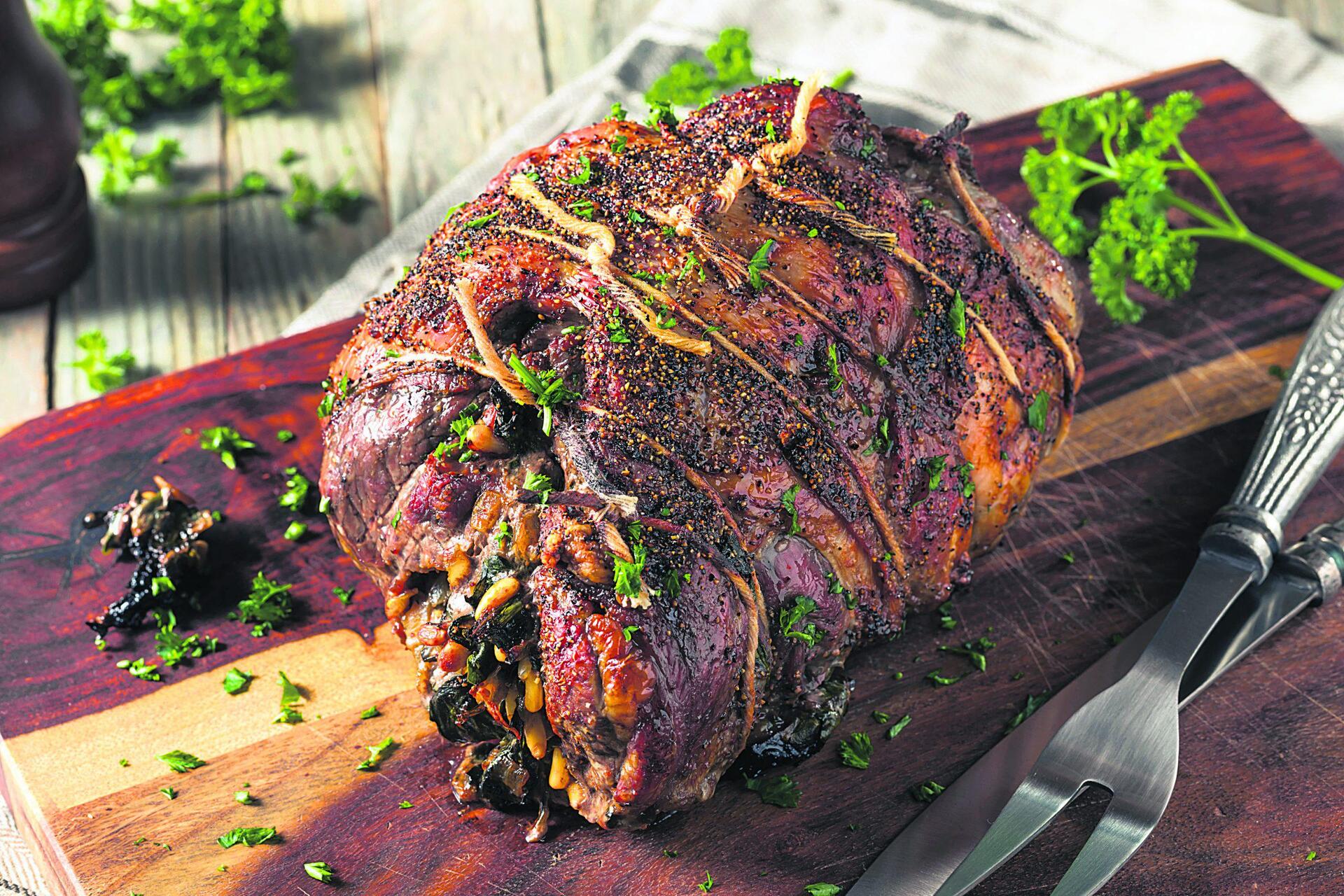 Αλείφετε το κρέας με λίγο από το λάδι και πασπαλίζετε τα μυρωδικά σε όλο το κομμάτι. Προθερμαίνετε τον φούρνο στους 200 βαθμούς και βάζετε το κρέας σε πυρίμαχο σκεύος, αν έχετε, αλλιώς σε ταψί με ένα φλιτζάνι νερό και ψήνετε για 1½ ώρα.