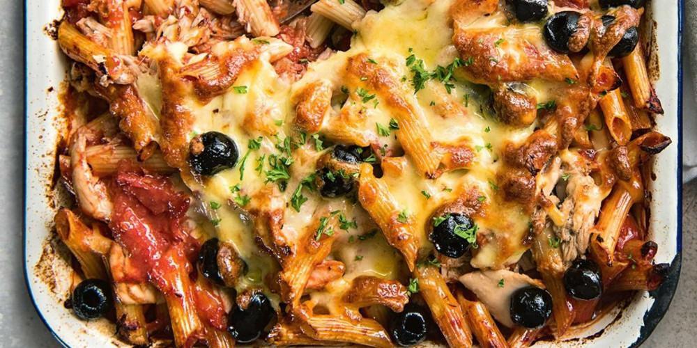 Περιχύστε τα μακαρόνια με τη σάλτσα, προσθέστε τις ελιές και τον τόνο και ανακατέψτε καλά. Μεταφέρετε το μείγμα σε ένα ταψί και ανακατέψτε με τα τυριά. Ψήστε για 25 περίπου λεπτά και γαρνίρετε με τον μαϊντανό όταν είναι έτοιμο.