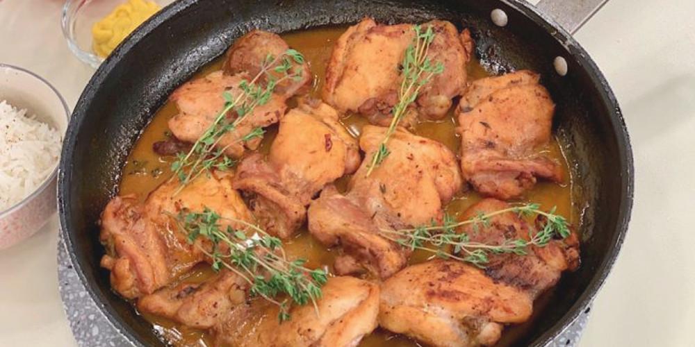 Σε ένα μπολ βάζετε τη μουστάρδα με το μέλι και ανακατεύετε με σύρμα. Προσθέτετε στο μπολ λίγο από το ζουμί της κατσαρόλας και ανακατεύετε. Ρίχνετε το μίγμα πίσω στην κατσαρόλα. Με αυτή τη διαδικασία η σάλτσα δεν θα κόψει όταν αναμειχθεί με τη μουστάρδα. Πασπαλίζετε με λίγο ψιλοκομμένο μαϊντανό και σερβίρετε ιδανικά με ρύζι μπασμάτι.