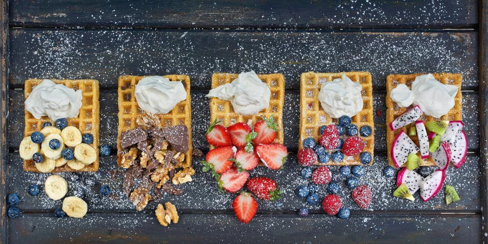 Σε μεγάλο μπολ αναμιγνύετε το αλεύρι, τη ζάχαρη και το μπέικιν πάουντερ. Σε ξεχωριστό μπολ χτυπάτε το γάλα και το βούτυρο. Ρίχνετε το μίγμα υγρών στο μίγμα στερεών και ανακατεύετε. Στο σταθερό μίξερ (ή με μίξερ χειρός) χτυπάτε σε δυνατή ταχύτητα τα ασπράδια σε μαρέγκα, δηλαδή μέχρι να γίνουν λευκή κρέμα και να σχηματιστούν απαλές κορυφές. Με μαρίζ (σπάτουλα σιλικόνης) αναμιγνύετε απαλά τη μαρέγκα με το μίγμα για βάφλες.