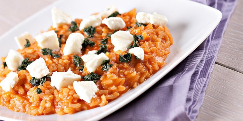 Ρίχνετε πάνω από το ρύζι τα κομμάτια του βουτύρου και το ξερό βασιλικό. Αφαιρείτε το σκόρδο, σκεπάζετε την κατσαρόλα με το καπάκι και αποσύρετε από τη φωτιά. Πασπαλίζετε με τα κομμάτια φέτας και σερβίρετε.