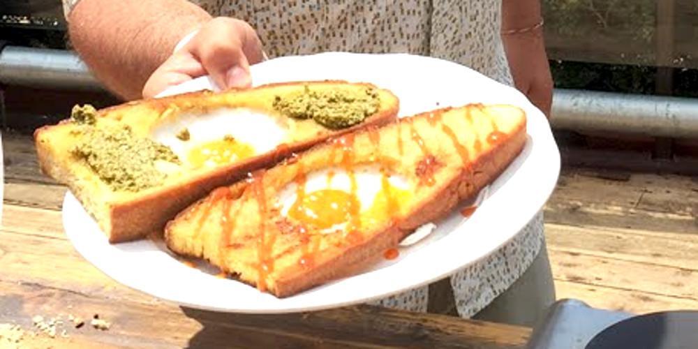 Σπάτε στο κέντρο της κάθε φέτας από ένα αυγό. Τηγανίζετε μέχρι να ψηθεί καλά. Σερβίρετε σε πιάτα. Γαρνίρετε με σάλτσα τσίλι ή σάλτσα πέστο και απολαμβάνετε.