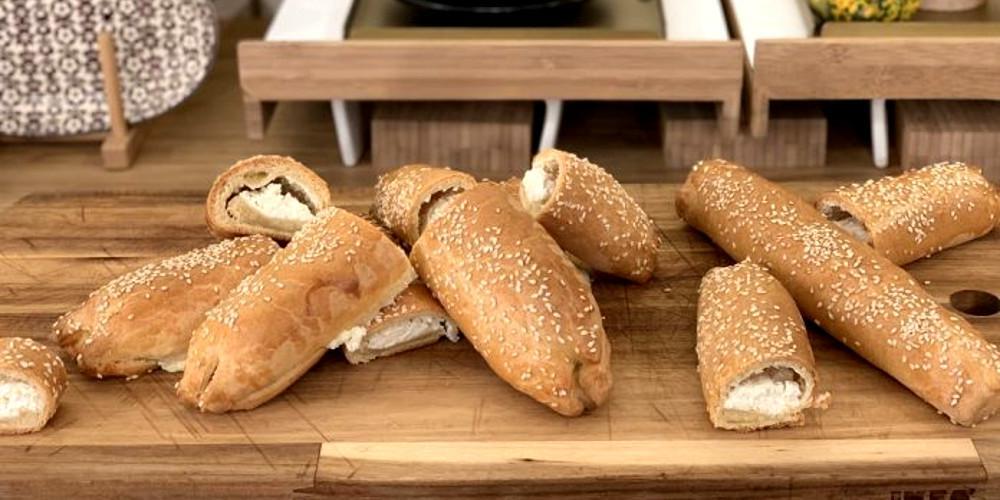 Τοποθετείτε 2 κ.σ. γέμιση σε κάθε κομμάτι ζύμης και με ένα πινέλο αλείφετε με αυγό περιμετρικά της γέμισης. Τυλίγετε σε ρολό και κόβετε τις άκρες της ζύμης.