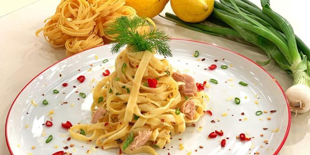 Προσθέτετε τη μισή ποσότητα τόνου, το χυμό και το ξύσμα λεμονιού. Ρίχνετε τις ταλιατέλες στο τηγάνι και λίγο από το νερό της κατσαρόλας που έβρασαν.