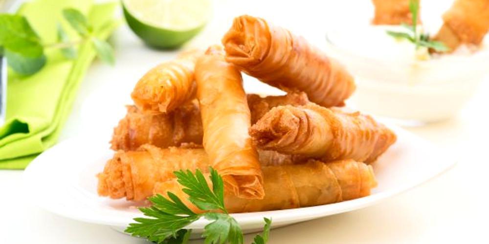 Βάζετε μια κουταλιά γέμιση στην άκρη κάθε φύλλου και το τυλίγετε διαγώνια ή σε ρολά. Με ένα πινέλο αλείφετε με λίγο από το μίγμα του κορν φλάουρ τη γωνιά και την κολλάτε στο φύλλο. Επαναλάβετε την ίδια διαδικασία με όλα τα υλικά.