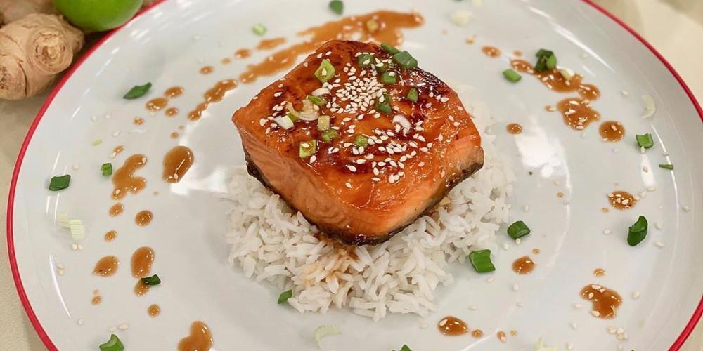 Αφήνετε να γλασάρει λίγο η σάλτσα σας και αφαιρείτε το τηγάνι. Βάζετε ρύζι μπασμάτι βρασμένο στο πιάτο σας, δίπλα τον σολομό και περιχύνετε με την σάλτσα. Προσθέτετε ψιλοκομμένο κρεμμυδάκι φρέσκο και σουσάμι.