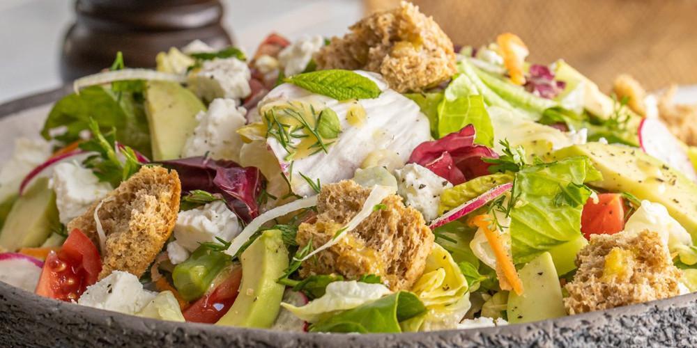 Σε ένα δεύτερο μπολ τοποθετείτε τα υπόλοιπα υλικά, εκτός από το αβοκάντο και τη φέτα, αλατίζετε και προσθέτετε την υπόλοιπη βινεγκρέτ. Αναμιγνύετε το μίγμα σαλατικών με τα λαχανικά όσο πιο ανάλαφρα γίνεται και σερβίρετε. Βάζετε τη φέτα και το αβοκάντο πάνω στη σαλάτα.