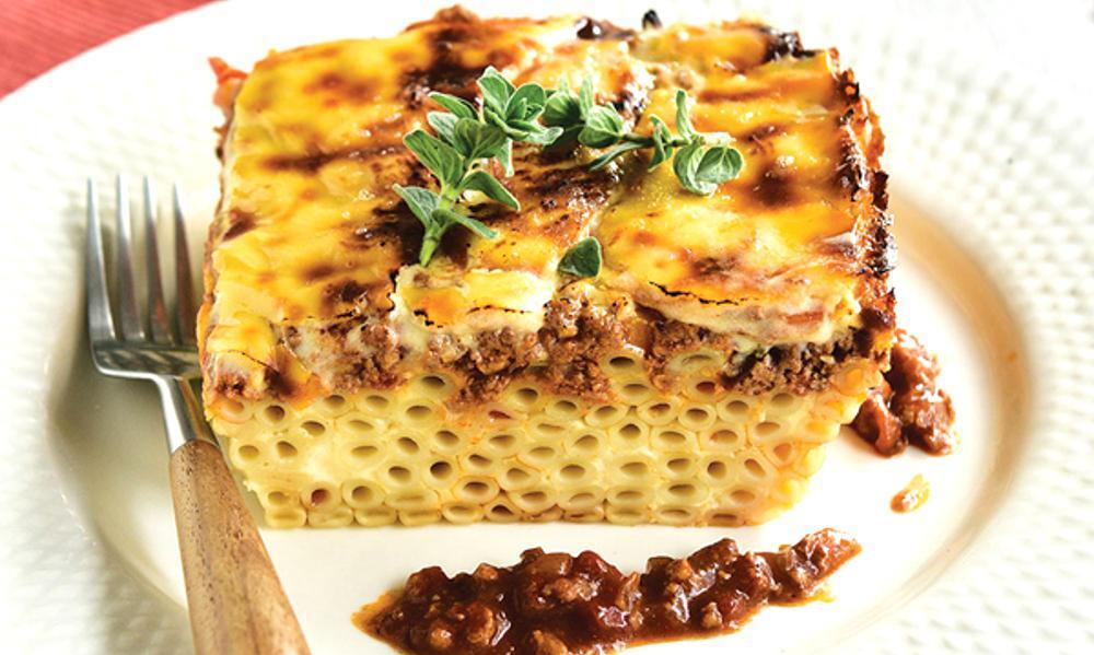 Ρίχνετε 1 κουτάλα της σούπας από την μπεσαμέλ στο μείγμα ζυμαρικών και τα ανακατεύετε να αναμειχθούν. Απλώνετε την υπόλοιπη μπεσαμέλ ώστε να καλύψει όλη την επιφάνεια ομοιόμορφα. Ψήνετε στην τελευταία σχάρα του προθερμασμένου φούρνου στους 180, για 45-50 λεπτά.