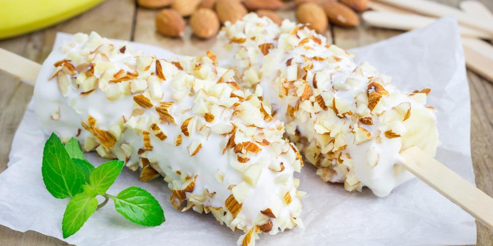 Καθαρίζετε μια μπανάνα, την κόβετε στη μέση και στερεώνετε τα κομμάτια σε δύο ξυλάκια. Ανακατεύετε το γιαούρτι με την κανέλα. Ψιλοκόβετε τα αμύγδαλα. Βουτάτε τα κομμάτια της μπανάνας στο γιαούρτι και τα τυλίγετε με τα αμύγδαλα. Τα βάζετε για μισή ώρα στην κατάψυξη και έτοιμα!