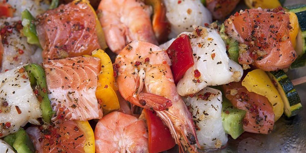 Σκεπάζετε το σκεύος με διαφανή μεμβράνη, βάζετε στο ψυγείο και αφήνετε να μαριναριστούν τα υλικά για 15-30 λεπτά. Σε 8 μεταλλικά ή ξύλινα σουβλάκια, που πρώτα έχετε βρέξει με νερό, περνάτε εναλλάξ ένα κύβο σολομού, πιπεριά, γαρίδα και χτένι.