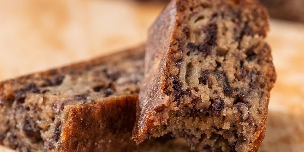 Μεταφέρετε το μίγμα σε ορθογώνιο ταψάκι στρωμένο με λαδόκολλα. Το ισιώνετε με τη μαρίζ να απλωθεί καλά σε όλο το σκεύος. Ψήνετε για 50-55 λεπτά. Ξεφουρνίζετε και αφήνετε το banana bread να κρυώσει.