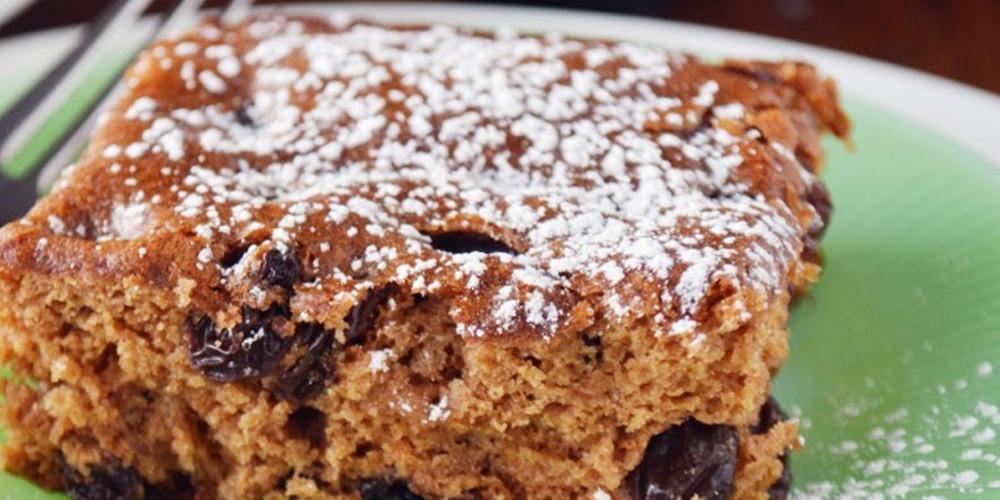 Ρίχνετε τα καρύδια και τις σταφίδες και ανακατεύετε καλά μέχρι να ενσωματωθούν τα υλικά. Μεταφέρετε το μείγμα σε ταψάκι και το ισιώνετε για να ψηθεί ομοιόμορφα. Ψήνετε για περίπου μία ώρα. Πασπαλίζετε προαιρετικά με ζάχαρη άχνη.
