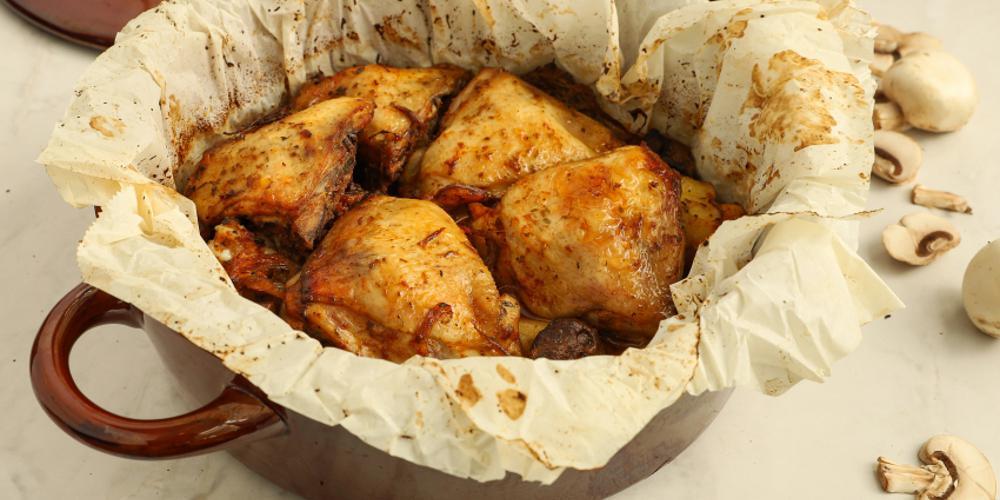 Κοτόπουλο μπούτι σιγομαγειρεμένο στη λαδόκολλα με πατάτες και μανιτάρια, από τον Γιώργο Τσούλη, μία συνταγή που θα σας λύσει τα χέρια!