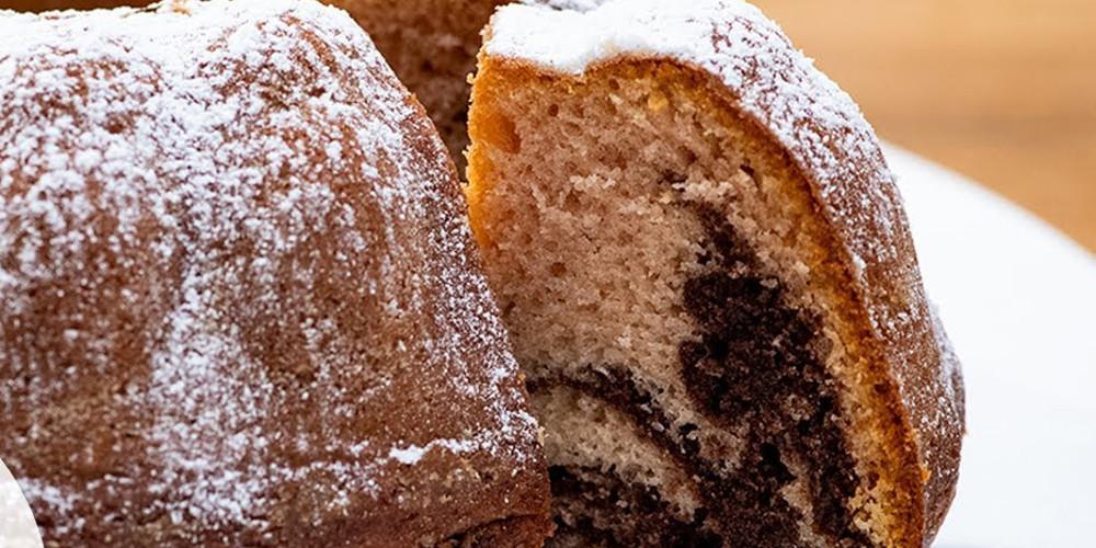 Βουτάτε ένα πιρούνι σε μπολ με ηλιέλαιο. Με το πιρούνι διπλώνετε το μείγμα ώστε να αναμειχθούν τα δυο χρώματα χωρίς να ενσωματωθούν απόλυτα. Ψήνετε για 50 λεπτά. Ξεφουρνίζετε το κέικ και το αφήνετε να κρυώσει προτού το ξεφορμάρετε σε πιατέλα. Πασπαλίζετε με μπόλικη άχνη ζάχαρη και σερβίρετε σε κομμάτια.