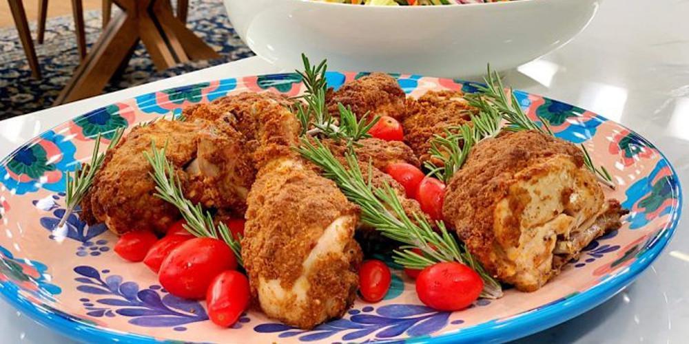 Ψήνετε στους 160 βαθμούς για 45 λεπτά. Τέλος ανεβάζετε τη θερμοκρασία στους 190 βαθμούς και ψήνετε για 20 λεπτά ακόμη ή μέχρι να γίνει το κοτόπουλο τραγανό. Σερβίρετε με σαλάτα.