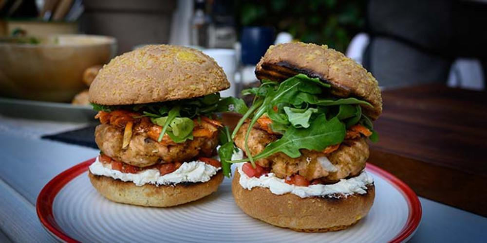 Ανάβετε το BBQ, πλάθετε τον σολομό σε μπιφτέκια και τα ψήνετε για 5-6 λεπτά, γυρνώντας ανά χρονικά διαστήματα. Όταν τα μπιφτέκια σολομού είναι έτοιμα, τοποθετείτε στο BBQ τα burger buns να ζεσταθούν για 1-2 λεπτά. Στήνετε τα burger τοποθετώντας τα υλικά με την εξής σειρά, το κάτω burger bun, φρέσκο τυρί κρέμα, την ψιλοκομμένη μαριναρισμένη τομάτα, το μπιφτέκι σολομού, το μαριναρισμένο καρότο, λίγη baby ρόκα και τέλος το πάνω burger bun και σερβίρετε.