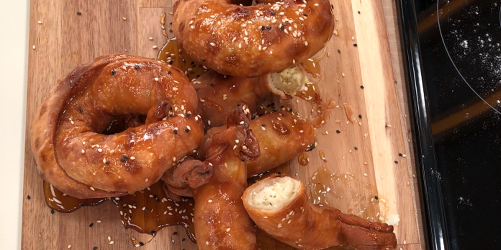 Με ένα πινέλο αλείφετε τη ζύμη σας παντού και στο κάτω μέρος της απλώνετε στην ευθεία και παράλληλα 3 κ.τ.σ από τη γέμιση, την σκεπάζετε τυλίγοντας το ρολό προς τα μέσα. Έπειτα τυλίγετε σε ρολό, σχηματίζοντας σαλιγκάρι. Την άκρη τη βάζετε προς τα κάτω ώστε να μην ξεκολλήσει. Την τοποθετείτε σε μια λαδόκολλα που έχετε αλευρώσει από πριν και την βάζετε στην κατάψυξη, πριν το τηγάνισμα ή το ψήσιμο, ώστε να μην ανοίξει το φύλλο σας.