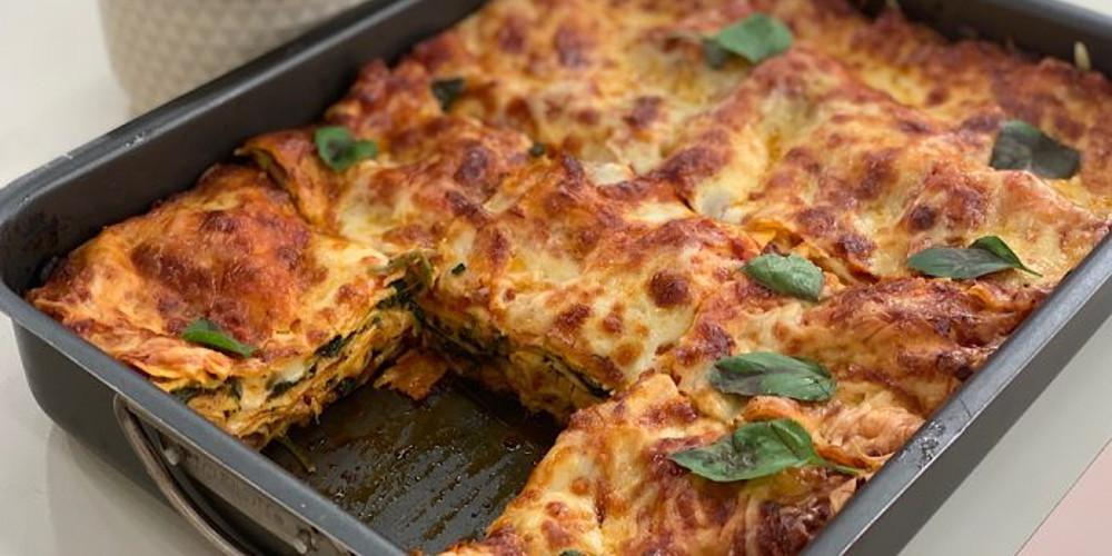 Βάζετε μία στρώση λαζάνια να καλύπτουν τον πάτο του ταψιού. Από πάνω απλώνετε σάλτσα ντομάτας και ρίχνετε διάσπαρτα λίγη ποσότητα σπανάκι, μανιτάρια και τυριά. Επαναλαμβάνετε τις στρώσεις με τα ίδια υλικά. Στην τελευταία στρώση, βάζετε πάνω από τα λαζάνια σάλτσα ντομάτας και μπόλικη μοτσαρέλα.