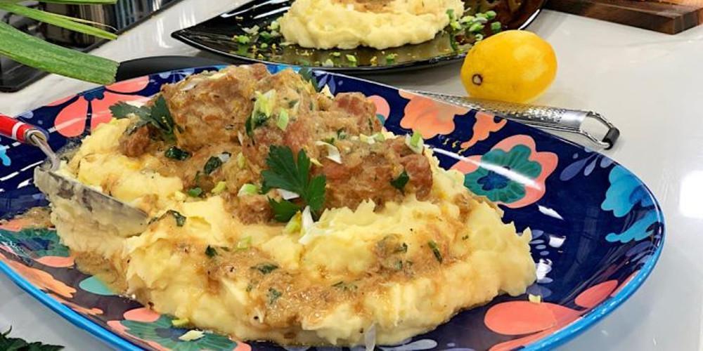 Για τη σάλτσα: Βάζετε σε ένα μπολ το γιαούρτι με τη μουστάρδα και το λεμόνι και ανακατεύετε με ένα σύρμα. Παίρνετε σιγά σιγά υγρό από την κατσαρόλα και προσθέτετε στο μπολ με το γιαούρτι, ανακατεύοντας συνεχώς. Δεν θα πρέπει να είναι καυτό το υγρό της κατσαρόλας, γιατί θα σας κόψει το γιαούρτι.