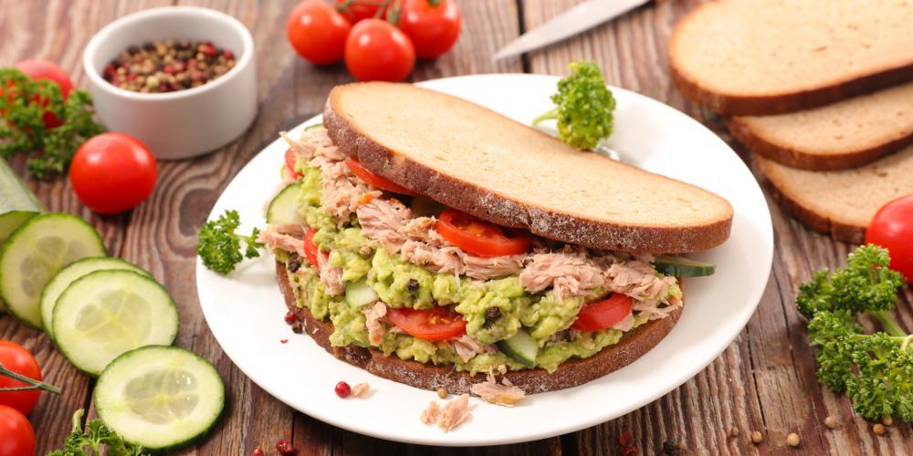 Σε ένα μικρό μπολ λιώνετε το αβοκάντο με ένα πιρούνι και αλατοπιπερώνετε. Σε ένα άλλο μπολ ρίχνετε τον τόνο, τη μουστάρδα και ανακατεύετε.