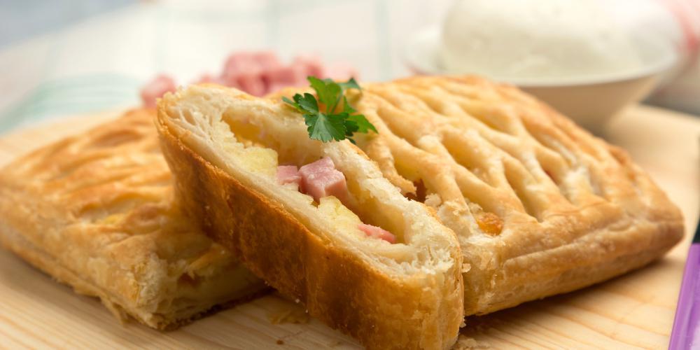 Ανοίγετε το φύλλο σφολιάτας και αλείφετε με ελαιόλαδο. Στη συνέχεια βάζετε πάνω στο φύλλο από 5 φέτες ζαμπόν, 5 φέτες τυρί και, τέλος, τις φέτες ντομάτα και το μπέικον ψιλοκομμένο.
