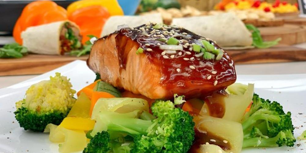 Βάζετε την μαρινάδα σε ένα τηγάνι και, όταν πάρει βράση, δένετε με το κορν φλάουρ. Βγάζετε απ’τη φωτιά και προσθέτετε το βούτυρο. Ανακατεύετε για να δέσει ωραία η σάλτσα σας και να πάρει ωραία σώμα. Τέλος βάζετε μέσα κρεμμυδάκι φρέσκο και σουσάμι. Σερβίρετε με λαχανικά ατμού, που τα έχετε κόψει σε κομμάτια και τα έχετε βράσει για 10 λεπτά. Τα βάζετε σε ένα μπόλ,αλατοπιπερώνετε και προσθέτετε 1 κουταλιά βούτυρο να αρωματιστούν.