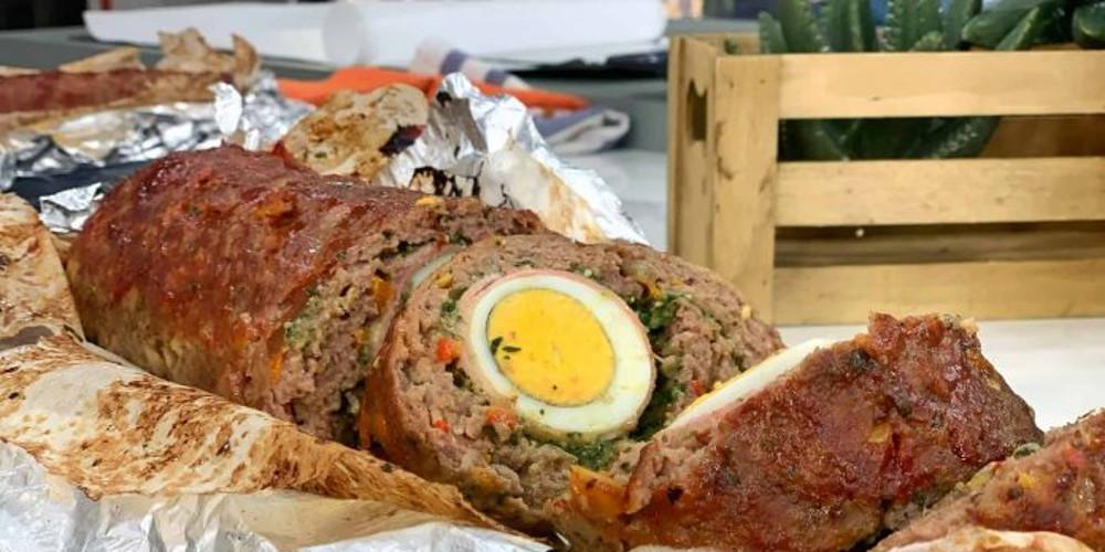 Απλώνετε ένα κομμάτι λαδόκολλα στον πάγκο, λαδώνετε με ένα πινέλο και απλώνετε πάνω το μείγμα σε ορθογώνιο παραλληλόγραμμο σχήμα περίπου 30εκ. χ 22εκ.. Αλείφετε το πέστο σε όλο τον κιμά. Περνάτε τα βρασμένα αυγά απο αλεύρι. Προσθέτετε τα βρασμένα αυγά, αφού τα έχετε τυλίξει με μπέικον. Με τη βοήθεια της λαδόκολλας, κλείνετε σε σχήμα ρολό. Στρίβετε τις άκρες ώστε να τυλίξετε σαν καραμέλα.