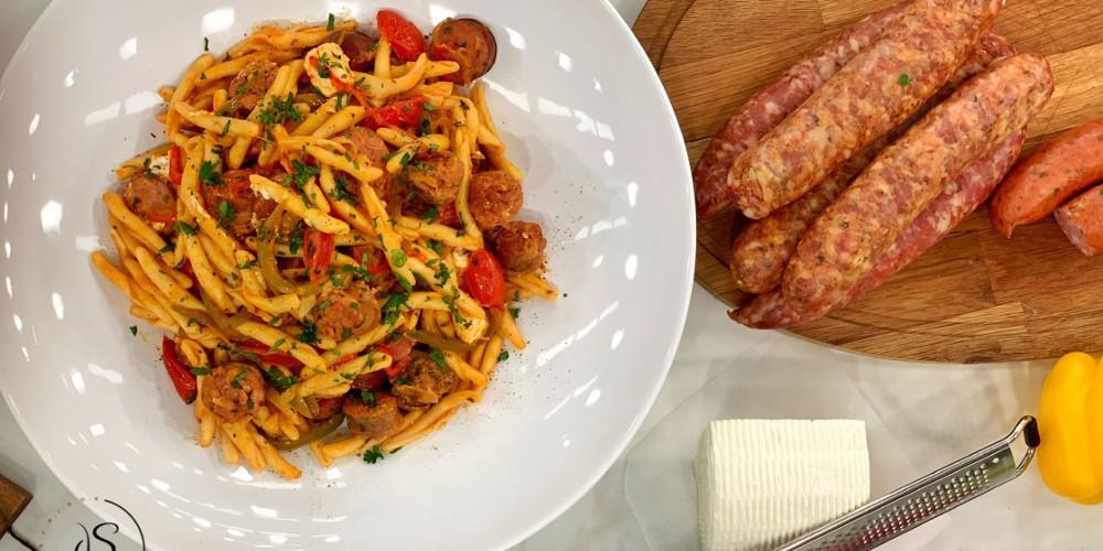 Κόβετε το λουκάνικο σε ροδέλες μέτριες, κόβετε το κρεμμύδι και το σκόρδο ψιλοκομμένα. Κόβετε τις πιπεριές ζουλιέν (σε μικρά κάθετα κομμάτια). Σε ένα μεγάλο βαθύ τηγάνι βάζετε ελαιόλαδο και σοτάρετε το λουκάνικο μέχρι να πάρει χρώμα. Προσθέτετε το ψιλοκομμένο κρεμμύδι, το σκόρδο και σοτάρετε για άλλα 2 λεπτά.
