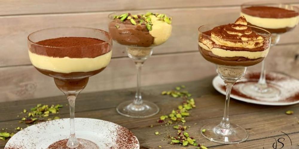 Για το στήσιμο: Χτυπάτε τις δύο μους με το σύρμα να αφρατέψουν και τις βάζετε σε δύο διαφορετικές σακούλες ζαχαροπλαστικής. Σερβίρετε σε ποτήρια ή μπολ βάζοντας κάτω την λευκή μους και από πάνω την μαύρη. Πασπαλίζετε με κακάο.