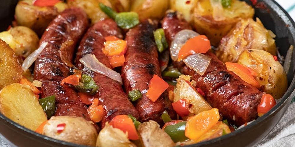 Επαναφέρετε στο τηγάνι τις πατάτες. Τις απλώνετε ομοιόμορφα με τη σπάτουλα. Με τη σπάτουλα τακτοποιείτε από πάνω τα λουκάνικα ώστε να ισομοιραστούν όλα τα υλικά στο τηγάνι. Προσθέτετε το νερό. Καλύπτετε το σκεύος με καπάκι. Αφήνετε να μαγειρευτεί το φαγητό για 10-15 λεπτά, μέχρι οι πατάτες να τρυπιούνται με το πιρούνι και το λουκάνικο να μαγειρευτεί.