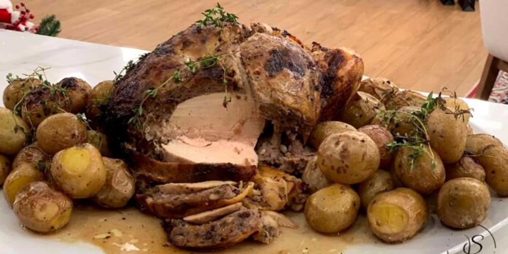 Καθαρίζετε το κοτόπουλο από το επιπλέον λίπος, που μπορεί να έχει στην κοιλιά του. Αφαιρείτε το κόκαλο από το λαιμό του. Κόβετε την ούρα και τα άκρα από τις φτερούγες. Σε ένα μεγάλο μπολ ανακατεύετε όλα τα υλικά της γέμισης και τα ανακατεύετε πολύ καλά.