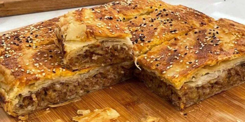 Βάζετε άλλα 4 φύλλα από πάνω περνώντας και πάλι με ελαιόλαδο. Σε ένα μπολάκι ανακατεύετε το ελαιόλαδο, το γιαούρτι και τον κρόκο. Στο τελευταίο φύλλο περνάτε με αυτό το μείγμα, πασπαλίζετε με σουσάμι και μαυροκούκι. Κόβετε την πίτα σε κομμάτια, ραντίζετε με λίγο νερό και ψήνετε στους 175 βαθμούς για 50 λεπτά στον αέρα και μετά δυναμώνετε λίγο για 10 λεπτά στους 200.