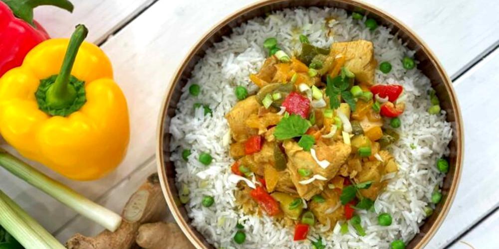 Στη συνέχεια τρίβετε το τζίντζερ και βάζετε 2 κ.τ.σ από τον χυμό του, το υπόλοιπο με τις ίνες δεν το προσθέτετε. Προσθέτετε το κάρυ και το αλεύρι και σοτάρετε για 1 λεπτό. Σβήνετε με τον ζωμό κοτόπουλου και στη συνέχεια προσθέτετε την κρέμα καρύδας και την ζάχαρη. Αλατοπιπερώνετε.