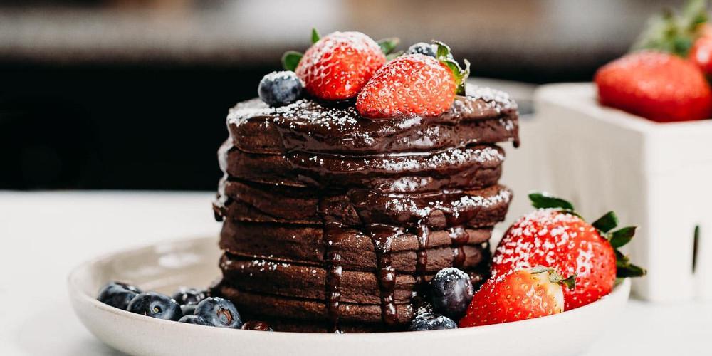 Για τη σάλτσα σοκολάτας: Ζεσταίνετε την κρέμα γάλακτος και προσθέτετε το βούτυρο. Βγάζετε από τη φωτιά και βάζετε τις σταγόνες σοκολάτας. Ανακατέψτε και γαρνίρετε τα pancakes.