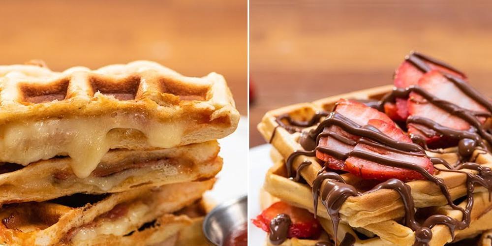 Βουτυρώνετε τη βαφλιέρα, την οποία έχετε θέσει σε λειτουργία. Ρίχνετε 4-5 κ.σ. από το μείγμα στη συσκευή και ψήνετε τις βάφλες σύμφωνα με τις οδηγίες του κατασκευαστή. Συνεχίζετε μέχρι να τελειώσει όλο το μείγμα. Σερβίρερε αμέσως. Μερικές ιδέες σερβιρίσματος είναι να συνοδεύσετε τις υπέροχες σπιτικές βάφλες σας με μέλι, παγωτό, λιωμένη σοκολάτα, μαρμελάδα, ζάχαρη, σιρόπι, φρούτα και ό,τι τραβάει η όρεξή σας! Φυσικά μπορείτε και με τσένταρ και αλλαντικά για αλμυρό αποτέλεσμα.