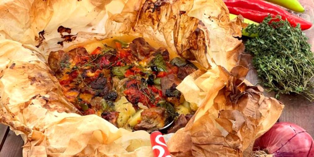 Κόβετε τις πιπεριές σε λεπτά μπαστουνάκια και τις προσθέτετε και αυτές στο μπολ, συνεχίζετε βάζοντας και το κρεμμύδι. Ανακατεύετε καλά και αφήνετε να μαριναριστεί για 1 ώρα. Σε ένα άλλο μπολ βάζουμε τις πατάτες που έχουμε κόψει σε ροδέλες, 1 κ.τ.σ ελαιόλαδο, 1 κ.τ.σ βούτυρο γάλακτος, 2 κ.τ.σ χυμό λεμόνι, αλάτι, πιπερι,1 σκ. σκόρδο, ρίγανη και ανακατεύουμε καλά. Απλώνετε στον πάγκο σταυρωτά 2 μεγάλες λαδόκολλες.