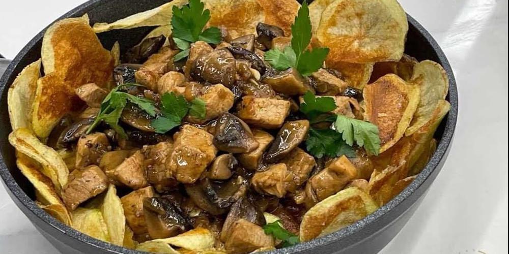 Αφήνετε να πάρει μια βράση, προσθέτετε την κρέμα γάλακτος, το αποξηραμένο πορτσίνι (που το έχετε βάλει στο μούλτι για να γίνει σκόνη) και τη σόγια σος. Βράζετε το μίγμα να δέσει. Σερβίρετε με πατάτες τηγανητές ή πιλάφι και γαρνίρετε με ψιλοκομμένο κατσαρό μαϊντανό.