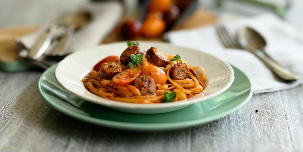 Τοποθετείτε μία μεγάλη κατσαρόλα με αλατισμένο νερό σε δυνατή φωτιά και βράζετε τα λιγκουίνι μέχρι να είναι al dente. Όση ώρα βράζουν τα ζυμαρικά σε ένα ξύλο κοπής με ένα κοφτερό μαχαίρι κόβετε τα λουκάνικα με μανούρι και ελιά σε φέτες, ψιλοκόβετε την πράσινη πιπεριά και τα ντοματίνια στην μέση.