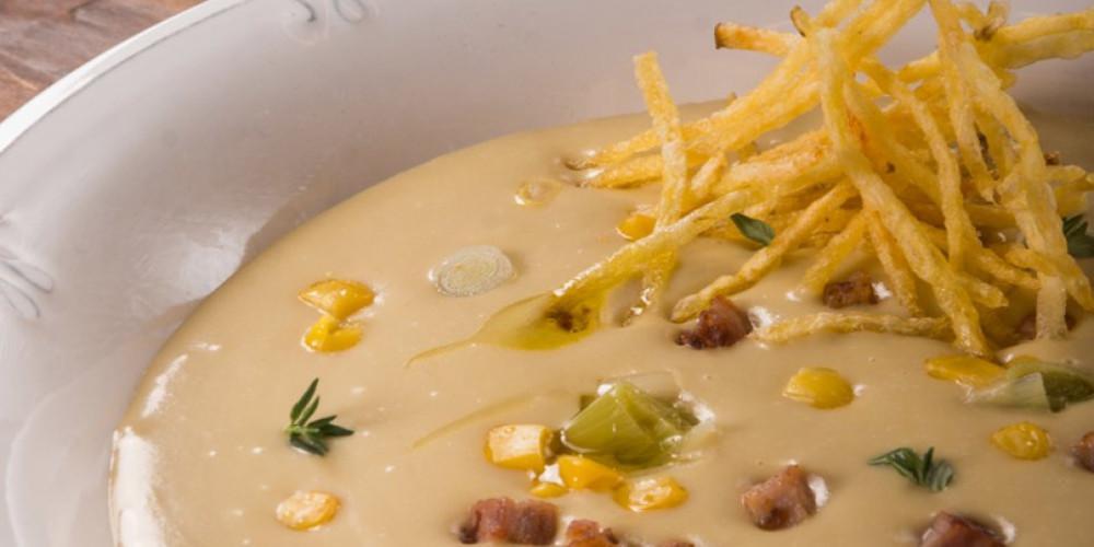 Προσθέτετε την κρέμα και μαγειρεύετε για 3 λεπτά ακόμη. Αφαιρείτε τα κλωνάρια θυμαριού. Με τη βοήθεια ενός μπλέντερ, αλέθετε πολύ καλά τη σούπα. Αλατίζετε και προσθέτετε αν θέλετε λίγη ζάχαρη και λίγο χυμό λεμονιού. Σερβίρετε, γαρνίροντας με λίγο γλυκό καλαμπόκι, ελαιόλαδο και φρέσκο θυμάρι.