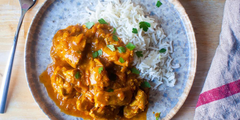 Βράζετε τη σάλτσα σε χαμηλή θερμοκρασία για 15 λεπτά και προσθέτετε το γιαούρτι αφού το έχετε ανακατέψει καλά. Ανακατεύετε για λίγο ακόμη και κατεβάζετε από τη φωτιά. Σερβίρετε με ρυζάκι.
