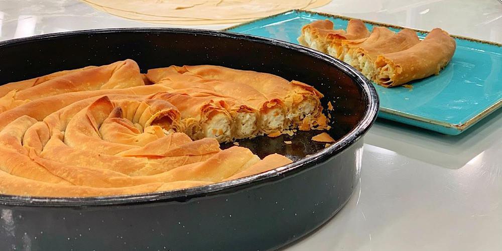 Έπειτα τυλίγετε σε ρολό κλείνοντας καλά τη γέμιση μέσα, μεταφέρετε σε ένα καλά λαδωμένο ταψί, ξεκινώντας κάνοντας σαλιγκάρι από το κέντρο του ταψιού. Συνεχίζετε με τα υπόλοιπα. Ψήνετε σε προθερμασμένο φούρνο στους 180 βαθμούς για 40 λεπτά περίπου έως ότου πάρει ωραίο χρυσό-καφετί χρώμα.